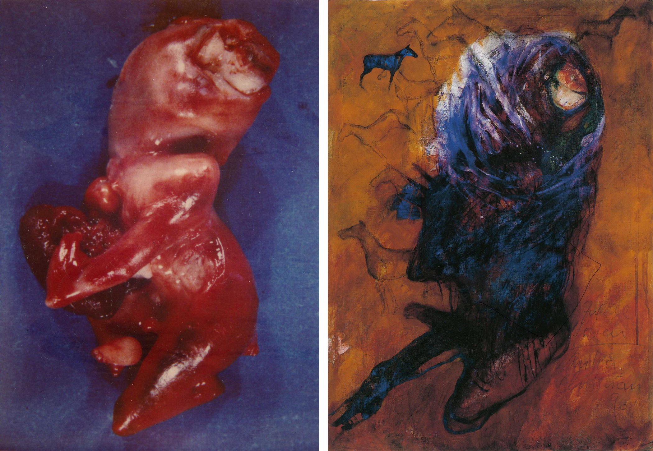 Ein Bekannter brachte mir im Jahr 1989 Vergrößerungen dieser erschreckenden und zugleich berührenden Photographien abnormer Föten und Fehlgeburten, deprimierende Beispiele aus fehlgeschlagenen Versuchen der Menschwerdung. Mit meinem malerischen Eingreifen in diese Abbildungen wollte ich dem Dargestellten, mit Beispielen anderer Existenzformen spielend, das absolut lebensfeindliche nehmen.